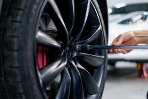 Auto mechanic man changing a wheel on a luxury white car using a balloon wrench at a car service station close-up