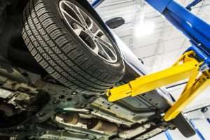 Broken Car on an Automotive Lift Inside Auto Service Center