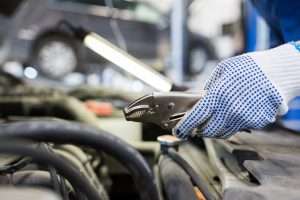 mechanic man with pliers repairing car at workshop